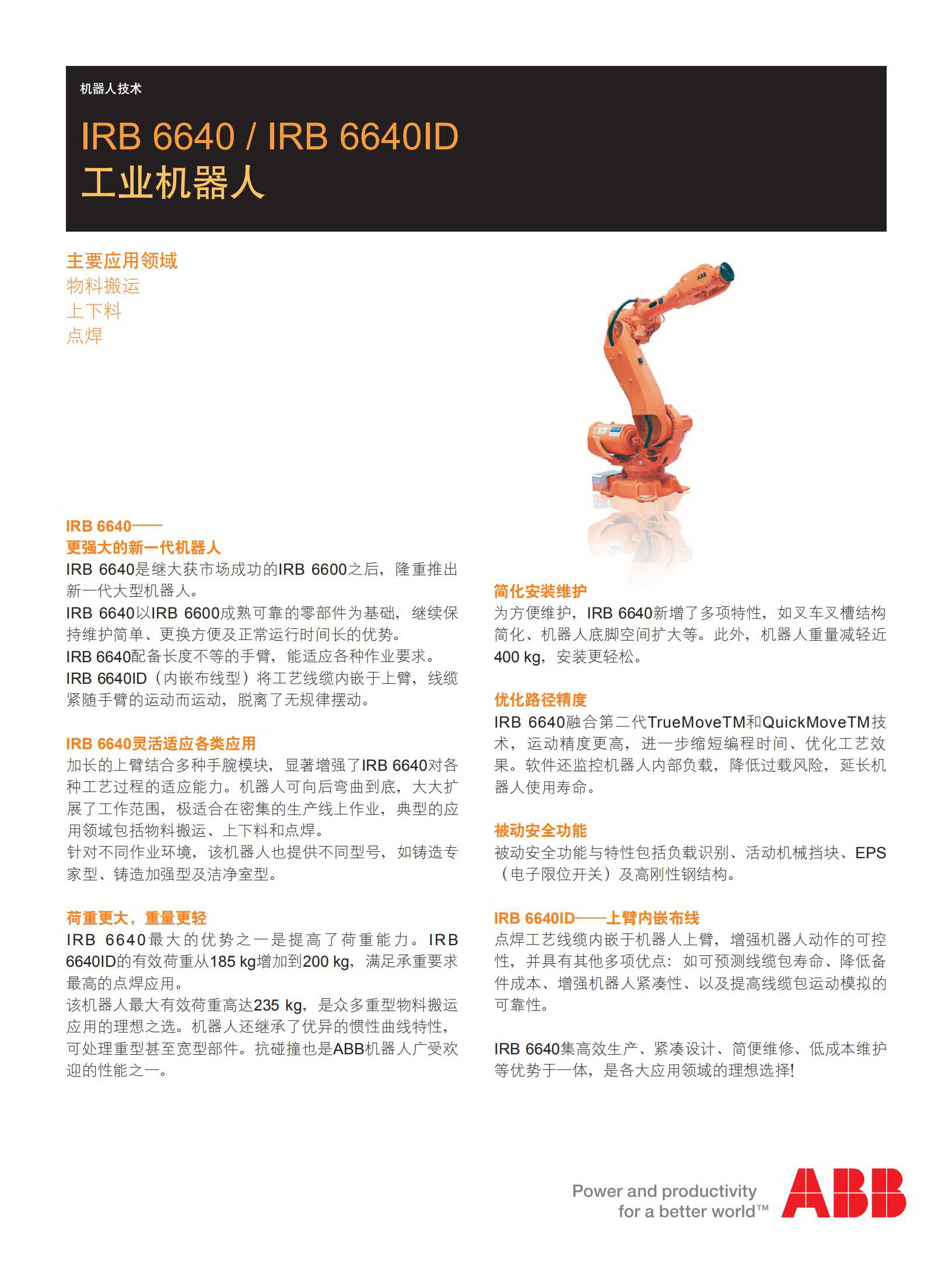 ABB機器人IRB 6640最大的優勢之一是提高了荷重能力。IRB 6640ID的有效荷重從185 kg增加到200 kg,滿足承重要求最高的點焊應用。該機器人最大有效荷重高達235 kg,是眾多重型物料搬運應用的理想之選。機器人還繼承了優異的慣性曲線特性,可處理重型甚至寬型部件。抗碰撞也是ABB機器人廣受歡迎的性能之一。IRB6640集高效生產、緊湊設計、簡便維修、低成本維護