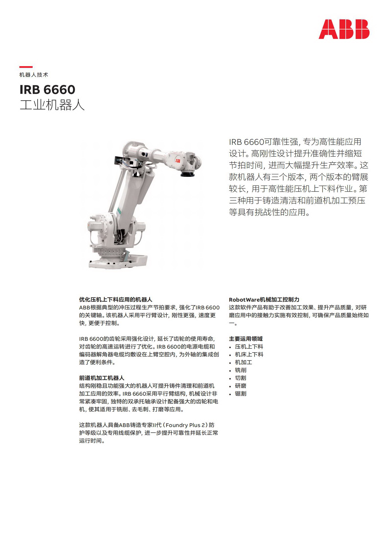 ABB機器人根據典型的沖壓過程生產節拍要求,強化了IRB6600 的關鍵軸。該機器人采用平行臂設計,剛性更強,速度更快,更便于控制。IRB6600的齒輪采用強化設計,延長了齒輪的使用壽命,對齒輪的高速運轉進行了優化。IRB6600的電源電纜和編碼器解角器電纜均敷設在上臂空腔內,為外軸的集成創造了便利條件。前道機加工機器人結構剛穩且功能強大的機器人可提升鑄件清理和前道機加工應用的效率。IRB 6660采用平行臂結構,機械設計非常緊湊牢固,獨特的雙承托軸承設計配備強大的齒輪和電機,使其適用于銑削、去毛刺、打磨等應用。這款機器人具備ABB鑄造專家II代(Foundry Plus2)防護等級以及專用線纜保護,進一步提升可靠性并延長正常運行時間。